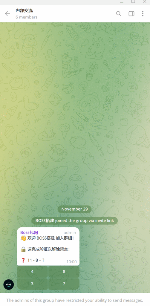 4. 自动禁言新成员(机器人需要管理员权限,永久禁言,直到通过验证)